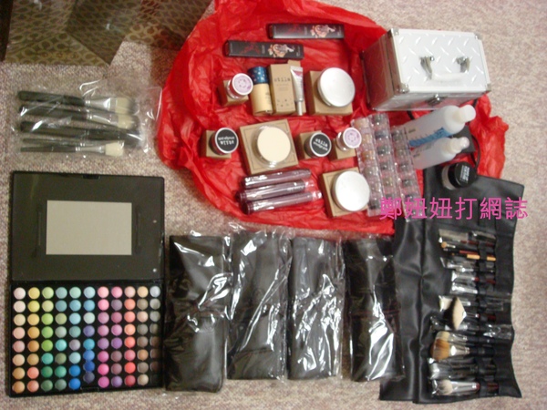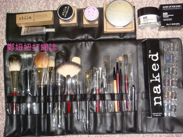 (圖中人物:我把我所有在去美妝展之前就有的刷具也放進刷具包裡嘍!雖然我不是彩妝師,可是輸人不輸陣啊!我的氣勢一定也要夠才行!我忽然覺得我好像可以聽到妞媽在一旁說:「鄭妞妞!你是有幾張臉,是有必要買成這樣?」我想我也只能說:『阿母,愛美是女人的天性,愛敗是妞妞的本能啊
