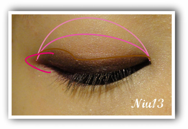 7. 用Kate的 C (桃紅色) 如圖沿著眼尾區域畫く字型然後拉長眼尾 (增加嫵媚度喔!)
