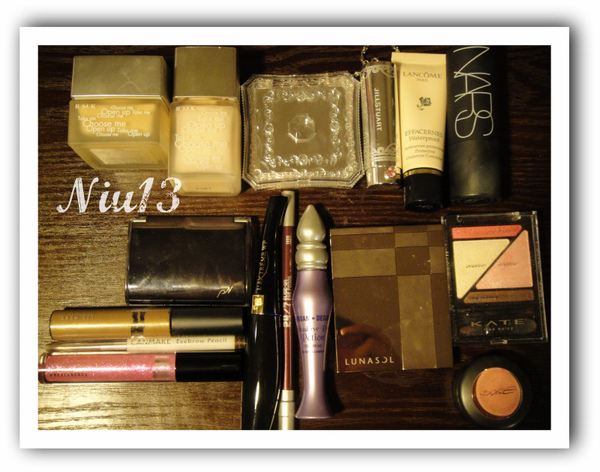 底妝:RMK 隔離霜, RMK 水凝粉霜, Lancome 眼部遮瑕膏, NARS ALL-IN-ONE 亮彩膏, Jill Stuart 甜心愛戀顏彩盤, MAC 限量 Commemorate 訂製蜜粉 (忘了照), Make Up Forever HD 微晶蜜粉 (忘了照)