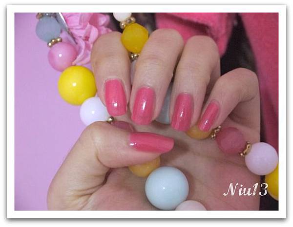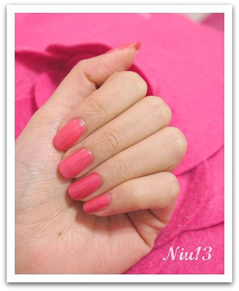 不帶螢光感、不俗氣的桃紅色帶著細緻的亮粉在燈光的折射下呈現甜美的如頰彩般的粉桃紅色。